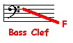 | Bass Clef- This is a common clef used for low instruments, but flutes *almost never* have to play in bass clef. No flute music is written in bass clef; the only time you would ever have to read it is if you are given, say a bassoon part, and asked to play it on your flute. (Pianos also play in bass clef. In stacked score for piano, the top staff is in treble clef for the right hand, and the bottom staff(s) is in bass clef for the right hand.) Anyway, bass clef is also called F clef because the 2 dots designate the fourth line from the bottom of the staff as F. Again, the rest of the notes just read up or down from the F. | |||||||||||||||||||||||||||