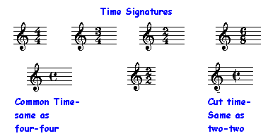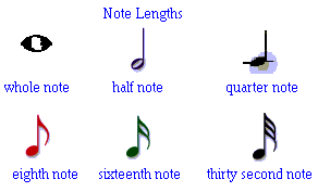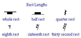 | Note Lengths, Rests, Time Signatures, Measures, and Rhythm Pictures of everything are at the bottom of the page!!! Measures Q: What is a measure? A: Measures are divisions in the music. Each measure consists of, depending on the time signature, anywhere from one to eight or more beats. At the end of each measure, the composer adds a bar line so musicians know that the measure is over and the next one is starting. Time Signatures Q: So, what is a time signature anyway? A: A time signature is a number at the beginning of the music that gives some basic information about the measures in that particular piece. It is written like a fraction, except without the fraction bar between the two numbers. Q: What do all those numbers mean? A: The top number refers to the number of beats in each measure, and the bottom number tells you what kind of note gets one beat. So if the top number was four, there would be four beats in each measure, if it was three there would be three beats, etc. If there was a four on the bottom, a quarter note would get one beat, if there was a two, a half note gets one beat, if there was an eight, an eighth note gets one beat, etc. Note Lengths Q: So, how do I know how long to hold the note? A: Well, this depends on the type of note and the note length that gets one beat, which can be found in the time signature. In a time signature with a four on the bottom, a quarter note gets one beat. This means that a half note gets two beats (because it is twice as long as a quarter note) and a whole note gets four. So then, an eighth note would get one-half of a beat, a sixteenth note one-fourth, and a thirty-second note one-eighth. If there is a number other than four on the bottom of the time signature, the length of the note or rest changes according to the new number. (So if the bottom number was two, a half note would get one beat, a whole note two, a quarter note one-half, etc.) Q: What does the dot after a note mean? A: The dot adds half of the value to the note. So, for example, a dotted half note would get two beats for the half note, plus half of that value, or one extra beat, for the dot. This means that the total length of a dotted half note is three beats. By the same rule, a dotted quarter note gets 1and 1/2 beats (one for the note and one-half for the dot) and a dotted eighth note gets three-quarters of a beat. Rest Lengths Q: How do I know how long to rest? A: The length of each different kind of rest corresponds to a type of note. For example, if a quarter note gets one beat according to the time signature, then a quarter rest also gets one beat. Check out the rest picture at the bottom of the page. Rhythm Q: How do I count rhythm? A: For each rhythm, there is a simple way to write down how that ryhthm is counted. For example, take a piece in four-four time. This means that there are four beats in the measure. A quarter note is counted by writing the number of the beat it occurs on directly below the quarter note. If a note lasts for more than one beat, place the numbers of all the beats below the note, then connect the numbers with dashes between them. For eighth notes, put the number of the beat under eighth notes that occur on the beat and "+" under the ones that occur on offbeats. Sixteenth notes can be counted by writing "(#)e+a" underneath each sixteenth in the group. Again, if the bottom number of the time signature is not four, the system will have to be adjusted based on the new lengths of the notes. Did You Know? If there is a number on the top of your music, like "MM=96," this is called a metronome marking. It refers to the number of beats per minute in the tempo. If you have a metronome, the metronome will help you to keep a steady beat at the correct tempo. If you do not have a metronome, click here to go to a list of flute stores where you can buy one. |