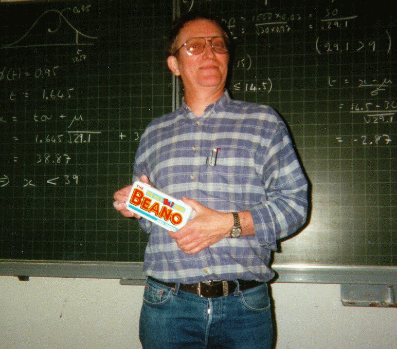 Mr. Smith's Beano pencil tin and his Oxo chalk tin are two of the greatest cult objects in ESK folklore. Here he proudly shows off this legendary object with a statistical calculation on the blackboard forming the backdrop.