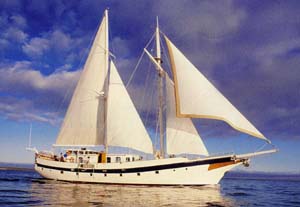 ![]() Diamante is a brigatine schooner Motor Sailer, a modern version of the great naval training ships. She first began her dedication to the Galapagos in 1993. Her 6 double cabins are made up of 4 cabins with comfortable upper/lower berths and 2 with double beds. Her interior is decorated with teak and mahogany and beamed dining room provides a great atmosphere. She is perfect for a relaxed cruise in the Islands surpassing all the standard safety equipment and upon request, she can be fitted with sea kyaks to paddle the bays when she is at anchor. With a sleek, elegant hull, stunning white sails, and top-notch service of her crew and guides, the Diamante is unbeatable for sailing in the Galapagos.