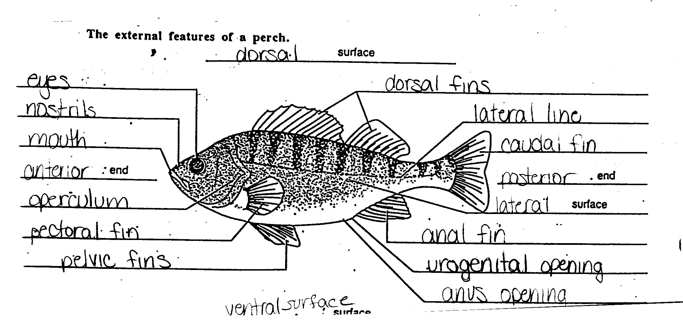 line. The perch has eyes, nostrils, a mouth, operculum, urogenital opening,