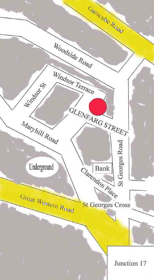 We meet in the Polish ex-services club, 26 Genfarg Street G20, next to the Woodside halls in Maryhill, Glasgow. We are a rainy nights walking distance from the St Georges Cross Underground station (which is still running when the club finishes for the evening), and are easily accessible by car from Maryhill Road. A local sketch map is shown in the right-hand column along with a slightly more detailed street map.