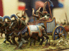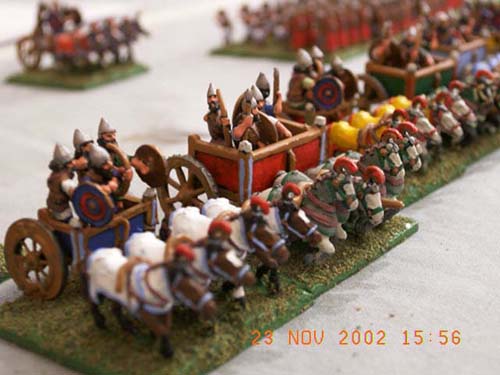 8) Determining armies: it is later in the game. Byblos, a Hittite Client, is defending with 15 bases against an 18 base Egyptian army. Pharaoh takes the standard list (4 LCh, 2 Bw, 4 Sp, 1 Bd, 1 Ps). Knowing they face a warband based army, they choose to increase it with another 4 LCh, 1 Bd and 1 Ps. The Hittites are defending a Client, so take a standard army of the appropriate type: in this case, Sea People (1 HCh, 2 WW, 8 Wb, 1 Ps) but get to supplement it with three bases from the Hittite list. This is where it gets difficult: do you choose heavy chariots to counter the Egyptian mounted arm, or hope to neutralize it with terrain, and take auxiliaries? Whatever the choice, a variety of different armies can be constructed with this method, giving varied games.
