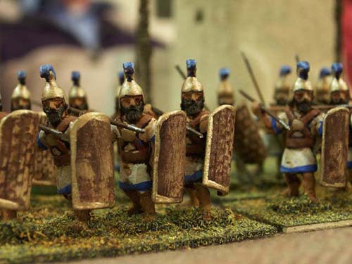 The first 12 bases of an attacking army is made up of a standard DBA list of the appropriate type. Any additional bases are made up of any combination of the relevant number of bases taken from the same list. Neutral defending armies are made up in the same way, using the list for that area. However, defending armies in an empire are slightly more complex. The first 12 bases of a Client or Ally state should be made up from the native army list: the remaining bases from the Imperial list. A Province will be defended by 12 bases of the Imperial list, supported by extra bases from the native list. The actual composition of armies should be written down secretly, but revealed before the terrain is determined.