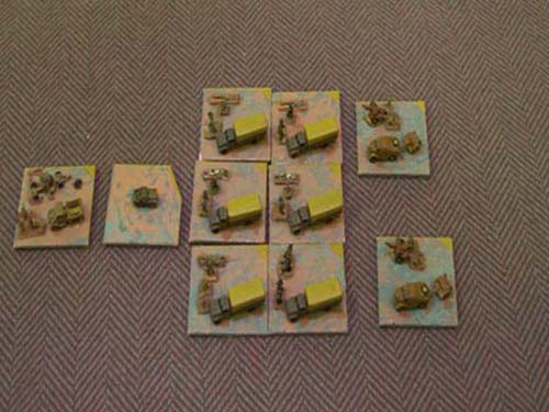 Up to 16 units may begin as Dug-in (in substantial trenches, protected by barbed wire, suitable model bases being required). Infantry, artillery, 88mm's, and HQ's improve their saving throw to 4+ and allows them to Spot 3" further, as well as allowing them shooting in the Dug-in phase. Note: troops Dug-in on a Hilltop only increase Spotting by 3" maximum. Tanks and Recon can be "in" the trenches but get no benefit from them. Troops in captured positions do not get the Spotting bonus as the trenches probably face the wrong way! Alternatively you may simply remove captured positions.