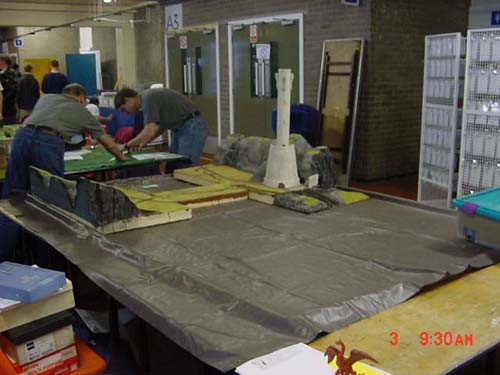 It takes 20 minutes to put up (including all the scenery and features) and takes 15-20 minutes to take down again. This obviously adds to the length of preparation time and deducts from playing time but the resulting terrain is well worth it. The whole thing fits easily into your car and is only the weight of a small person to transport. It�s a job for two. We have a rule that anyone in the club may use the table but it must be operated by at least two people.