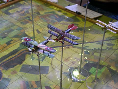 Undoubtedly the hit of the show with those new to wargaming was the Kirriemuir participation game based on Baron Richtoften's flying circus. Using what looked suspiciously like extendable TV 'bunny ears' to facilitate 3d flying, the produced a quick and enjoyable game of WW I dogfighting.
