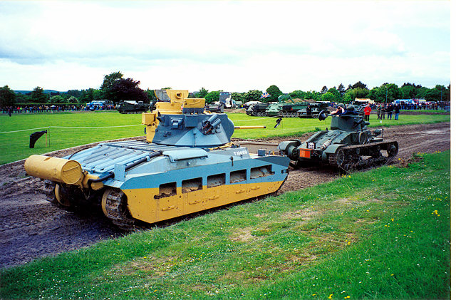 These vehicles had a crew of four (Commander, Gunner, Loader, Driver) and had a maximum road speed of 15 mph and maximum cross country speed of approx 8 mph. Marks IV & V had provision for an auxilliary fuel tank, as seen in the photographs on this page which are of the vehicle at Tankfest 2002, Bovington. In the top and bottom photos, the accompanying vehicle is the A11 Matilda, which makes for an interesting comparison.