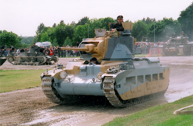 This vehicle, originally intended as a larger version of A11, was in fact a completely new design derived from A7. It was heavily armoured and carried a 2 pdr main armament. A limited number were in service with the BEF in France in 1940 and were used by 7th RTR with some success at the Battle of Arras just before the evacuation at Dunkirk. Subsequently they were used in the Libyan desert where their heavy armour protected them well from Italian anti-tank weapons, but not from the famed German "88". After 1942 the Matilda was largely used as the basis for a number of special purpose variants, as its limited turret ring diameter meant it was difficult to up-gun the vehicle from the 2 pdr main armament.