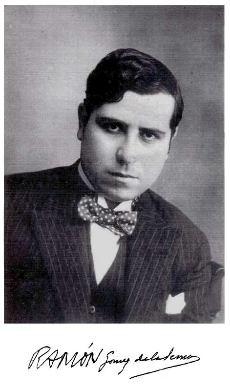 Fotografía publicitaria de 1922, cuando Ramón "De mi fecundidad se ha querido hacer un arma contra mí. Pero ¿cómo voy yo a no encontrar injusto eso si a cada cosa le sigo dedicando la atención entrañable que necesita y no puedo realizar mis proyectos y veo retrasadas mis últimas obras en las casas editoras? " (Ramón Gómez de la Serna, Automoribundia, capítulo XLVIII.) |