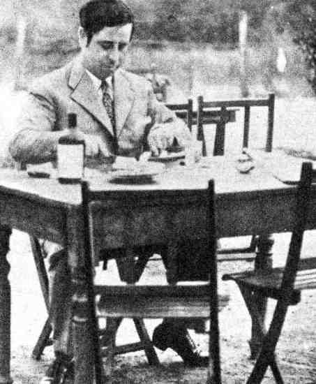 Ramón en el merendero "La Bombilla", Madrid "En las cenas solemnes, ahogado al ver que no me daban más vida sino que me la quitaban, he planteado las dos elegancias del cenar, una estilo Duque de Alba y otra estilo arriero. El estilo arriero tiene desde luego una sopa de entrada que es el ajo arriero, y su primera máxima es que si no se mancha el mantel ni se ha comido ni se ha vivido. [...] En el arrierismo hay que ser sopón, porque sólo el pan uberrimiza todas las sustancias de las salsas. Los arrieros comen sin servilleta, pues si bien hay que manchar el mantel no debe mancharse uno ni necesitar la servilleta. [...] Claro que por mis exquisitos modos de arriero me dejaron de convidar en algunas casas, pero bien sabe Dios que eso no me importó. Siempre me beberé de un trago los vinos buenos -ya saborearé la tercera copa-, pues si fuesen vinos malos los tomaría con temor y lentamente." (Ramón Gómez de la Serna, Automoribundia, capítulo LXXXVII.) |