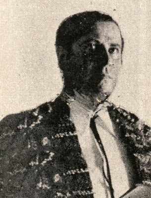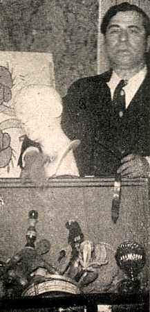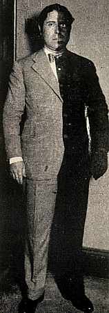 Ramón Gómez de la Serna dando una conferencia maleta "Di nuevas conferencias en Amigos del Arte [Buenos Aires, 1933] bajo los auspicios de mi hada madrina, señora de Elizalde, y hablé sobre el toreo vestido con traje de luces, hablé en primera persona como Napoleón vestido de Napoleón, de Goya vestido de su época y del Greco con ferreruelo y gola, frente a una reproducción que mandé a hacer de 'El caballero de la mano en el pecho', y que mediante un artilugio distendía el brazo después de tenerlo en cabestrillo durante siglos, y sobre los Medios Seres vestido de medio ser, para lo que mandé teñir medio traje príncipe de Gales y me embadurné media cara." |