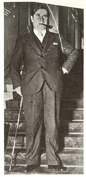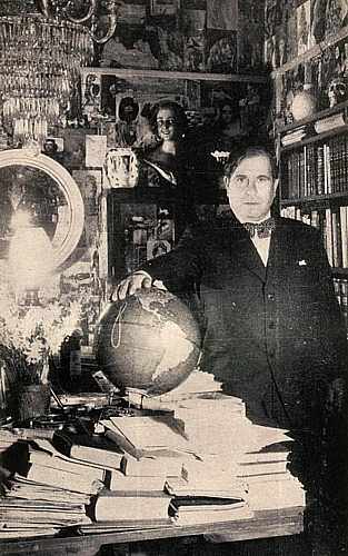 Ramón en su casa de Buenos Aires, hacia 1947 "Tengo el brazo derecho más largo que el izquierdo de tanto escribir." (Ramón Gómez de la Serna, Automoribundia, capítulo #####.) |