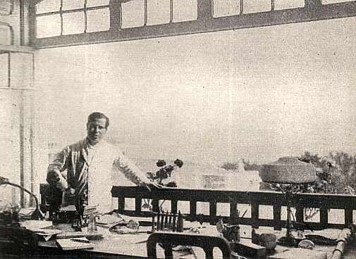 Ramón escribiendo en el "torreón" de la calle Velázquez, Madrid "Yo y la lámpara, y así trabajando días y días de lluvia, de frío, de encierro." (Ramón Gómez de la Serna, Automoribundia, capítulo ###.) |