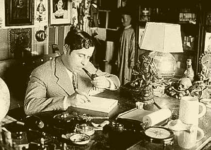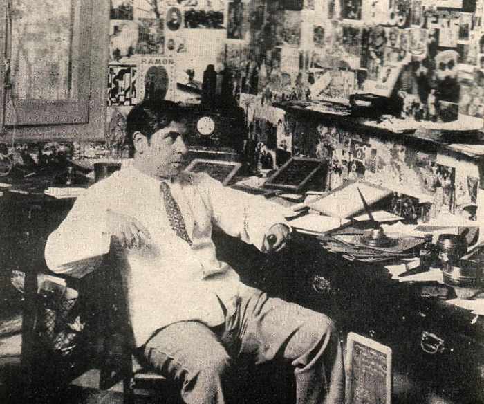Ramón en su estudio de la calle Velázquez "Rodeado de aquellas cosas había yo asentado a mi alrededor un ambiente propicio que me picotease sin tregua para estímulo del siempre escribir." (Ramón Gómez de la Serna, Automoribundia, capítulo #####.) |
