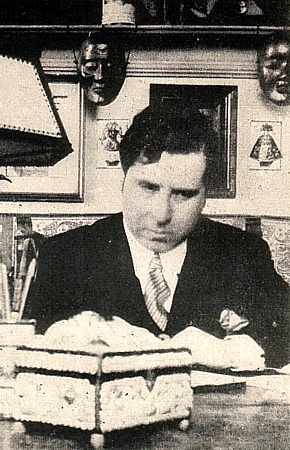 Ramón en su estudio de la calle Hipólito Yrigoyen, Buenos Aires "Mi estancia frente a la mesa ha sido ímproba porque lo que más sé es que si no se ponen unas palabras detrás de otras no hay literatura, muchas palabras unas detrás de otras, millones de palabras." (Ramón Gómez de la Serna, Automoribundia, capítulo XLVIII.) |