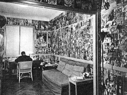 Ramón en su estudio de la calle Villanueva, Madrid "Confieso que según iba cubriendo las blancas paredes de imágenes sufrí el agobio de las representaciones, y, a veces, me tuve que sentar desvanecido, enfermo de una pesadilla sin fiebre ni neurastenia. [...] (Ramón Gómez de la Serna, Automoribundia, capítulo LXVIII.) |
