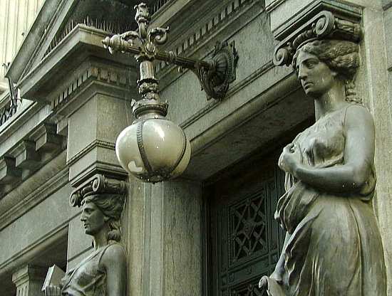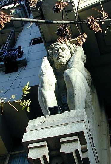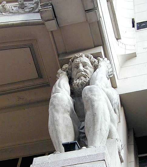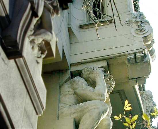 Cariátides de Buenos Aires, en el barrio donde vivió Ramón "Ninguna resignación tan bárbara como la de las cariátides. Con la cabeza baja parecen mozos que llevan interminablemente un gran armario de luna o un piano. Están esperando llegar, ¿adónde?...." (Ramón Gómez de la Serna, "Las sufridas cariátides") |