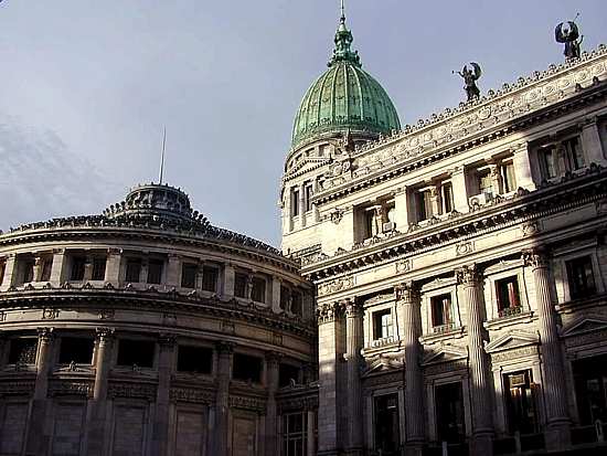 Congreso Nacional, Buenos Aires, en la esquina de la casa donde vivió Ramón "La política misma tiene de raro, de estrambótico y de eficaz que es cursi. Sólo la política cursi tiene éxito, y el Parlamento vive porque es lo más cursi del mundo, con sus taquígrafos, sus pupitres, su presidencia, sus escribanías y su campanilla." (Ramón Gómez de la Serna, "Lo cursi", en Lo cursi y otros ensayos, Buenos Aires: Sudamericana, 1943.) |