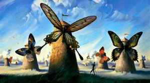 *Ich muß gestehen, daß mir - der ich kein ausgesprochener Fan von Dalí, geschweige denn ein Kenner seiner Werke bin - dieses Bild unbekannt war, bis ich dieses Lied hörte; dann bin ich natürlich gezielt auf die Suche gegangen und fündig geworden. Wie fast immer bei D. ist das Motiv sehr originell - man beachte auch den kleinen Don Quixote in der Bildmitte -, wenngleich man über die Ausführung im Einzelnen streiten kann. Jedenfalls paßt es auf dieses Lied wie gemalt: Windmühlen im Herzen, Schmetterlinge im Bauch, Schmetterlinge auf den Windmühlen - wo ist da schon der Unterschied? ;-)