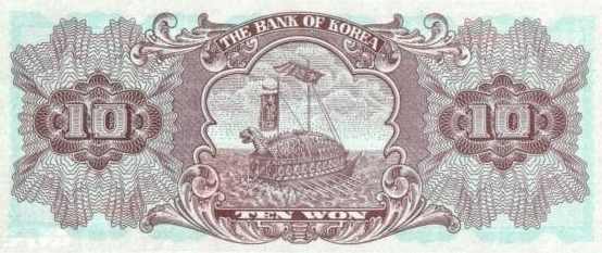 Übrigens war auch der deutsche 10-Mark-Schein entgegen weitverbreiteter Ansicht nicht die einzige Banknote der 1960er Jahre mit einem Schiffsmotiv; auch der südkoreanische 10-Won-Schein hatte eines, und zwar überraschenderweise nicht etwa eine Dschunke o.ä., sondern eine Art überdachtes Wikingerschiff aus dem Mittelalter:
