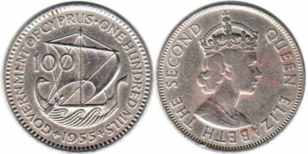 100-Mils-Stück der 1950er Jahre. (Fällt Euch etwas auf, liebe Musikfreunde, auch bei den vorigen Abbildungen? Während sich die Engländer zuhause mit Händen und Füßen dagegen wehrten, das Dezimalsystem einzuführen, hatten sie es in ihren Kolonien längst getan!) Allerdings degradierten sie es und verschoben es auf das 5-Mils-Stück. (Auf ihr neues 100-Mils-Stück setzten sie statt dessen einen gehörnten Muffelschafbock ;-)