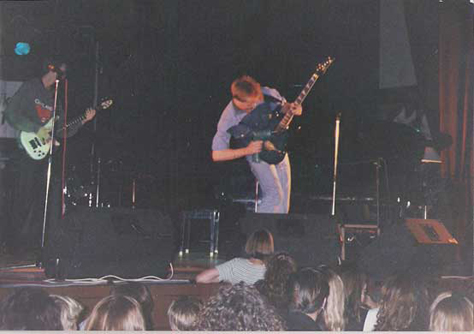He also played baritone saxophone with the Gorokan High School band although he was never a student at that school. His saxophone tutors included Dianne Gardiner and Andrew "Jock" Robinson. He learned the Dexter Gordon version of "The Shadow of Your Smile" note for note, completely by ear and this became his party peice. Hasaan bought a second hand Ibanez RG550 and had it stripped down, carved into the shape of a flame and repainted. He joined a comedic rock band fronted by talented percussionist Chris Young that was callled "Smutty Crud" and participated in a "Battle of the Bands" competition in which Hasaan played guitar and sang lead vocals. The group performed several difficult instrumentals by Frank Zappa and also "Montana" in which Hasaan sang the impossible polyrythmic vocal parts doubled on guitar. During the performance, Hasaan's old Marshall JCM900 amplifier set fire to a black curtain and a member of the audience jumped onto the stage with an extinguisher while Hasaan kept soloing with the "inferno" behind him. This incident was captured in a photograph and the image of (what appeared to be) a burning amplifier and flame-shaped guitar contributed to Hasaan's reputation as a "wild rock kid".