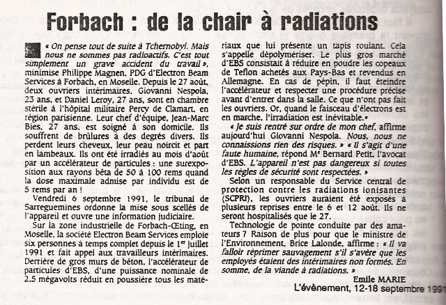 Finalement, la seule erreur commise par le PDG de Forbach est d'avoir permis que ses employés effectuent un travail donc les conséquences sont apparues alors qu'ils étaient encore dans l'entreprise. Comme tout aurait été plus simple si une quelconque maladie aucunement professionnelle... mais néanmoins fatale, les avait atteint quelques années plus tard. N'en déplaise au démagogue Brice Lalonde, les "intérimaires non formés" sont des exécutants idéals pour les sales boulots nécessaires à cette société qu'il défend et dans laquelle il joue les starlettes. Sans doute préférerait-il des intérimaires formés... grâce à l'apprentissage, cheval de bataille de sa patronne Mme Cresson.