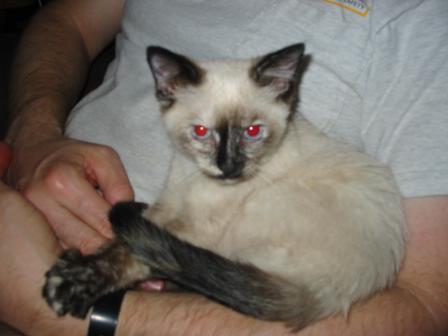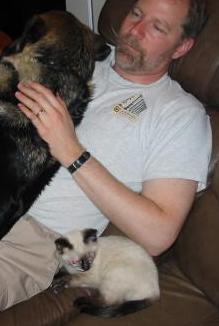 Maddie settled in almost immediately and got along with the other pets quickly. Lulu and Nisa hissed at her for a couple of days, but Rusty and Bruno seemed to think that it was okay that there was a little one in the house again. They needed a little extra attention for a few days, though; as you can see in the above, it was Rusty who needed to be in Hugh's lap the night Maddie came to live with us. We didn't know how 3-pound Maddie would react to 60-pound Rusty and Bruno; to our surprise, she rubbed up against their noses! This cat either knows no fear or knows no enemies.