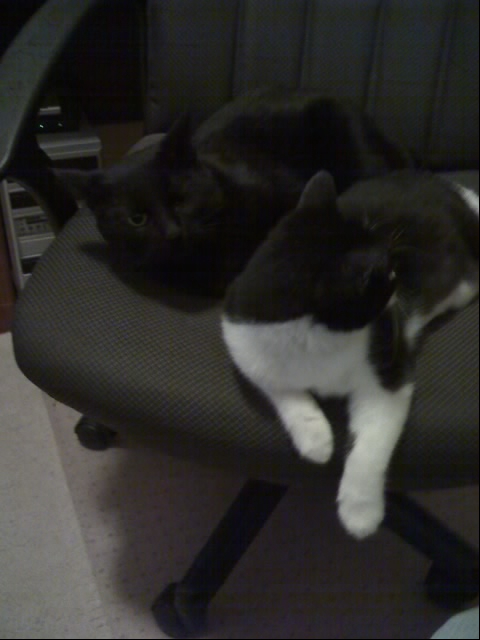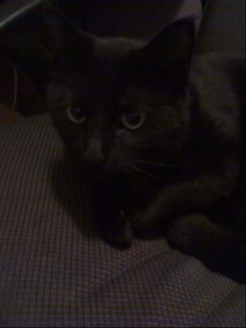 Mason came into our family in February of 2008. He came from the Humane Society shelter. Kind of hard to see a black cat on a black chair, eh?