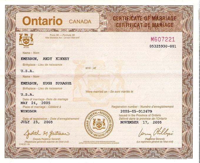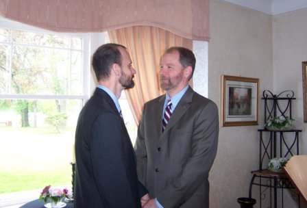 | We have been together since the summer of 1995, and we got engaged in the winter of that year. We decided that if it were ever possible for us to get married, we would do so. Regardless of one's feelings about such relationships, one would hopefully concede that this one is for keeps. These are two inviduals who have lost a lot of hair together, been through three moves together and have weathered the loss of four cherished pets in these last ten years. After the big flurry of activity on the legal front in the summer of 2003, we decided we'd wait a bit, and we decided at some point in 2004 that we'd get married on the tenth anniversary of the day we met (May 8, 1995). We ended up being off by a few days, but what's a few days when you've been waiting for a decade? We were hoping for Massachusetts, but couples cannot get married there if the marriage would not be valid in their home state, and that won't be any time soon for Missouri. Several provinces in Canada recognize same-sex marriages, and as it turns out, Ontario isn't as far as, say, Massachusetts or California, so that seemed to work out for us. One caveat: although there is no waiting period for marriages in Ontario, a couple has to live there for at least a year in order to get a divorce! | |