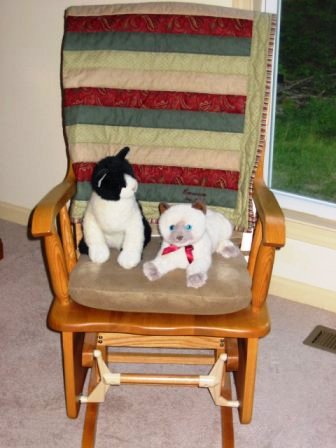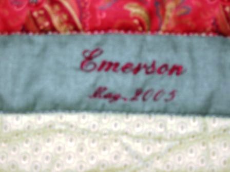 | Here's a detail of the quilt showing the embroidery. Of course, if you have truly excellent eyesight, then you could probably read this above the head of the Siamese stuffed kitty above. Speaking of Siamese... | ![]() |