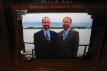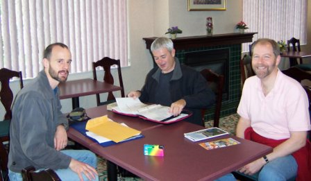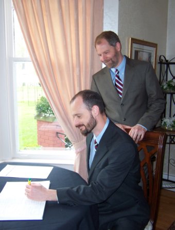 | After the ceremony, everyone (the officiant, the two witnesses and the happy couple) had to sign the wedding registry, then the officiant finished filling in all the other blanks, and then we went outside for some more pictures. Here's a Andy signing the registry while Hugh looks on. After we were done with the pictures (it was starting to rain a bit), we went back to the B&B to change clothes. We had gone right through lunch, so we found a restaurant nearby and had pizza and soup. Of all the restaurants in Windsor, how did we end up at the only restaurant whose zuppa del giorno (soup of the day) was Italian Wedding Soup? We rode bikes around town for a while, did some shopping at the Devonshire Mall (warning: kind of a noisy web site. You might want to turn down your speakers first.), and when it came time to have dinner, we ended up going to the buffet at the Casino Windsor. No, we didn't gamble, but the food was good. What a day! | ![]() |