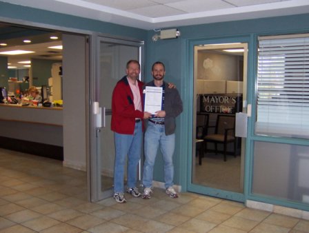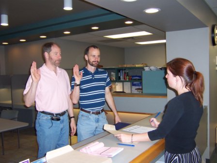 | Here we are getting ready to leave the courthouse with our license. Andy: this was the point at which the whole experience became real for me. After a 9-year wait, an actual marriage license! | ![]() |