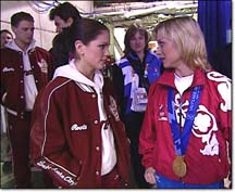 Canada's Elvis Stojko made the decision to turn pro after the Olympic Games. The World Champion and two time Olympic silver medallist did not manage to capture a medal this year. Xue Shen and Hongo Zhao of China won their first Olympic medal in Salt Lake this year. Capturing the bronze, their win was very quiet compared to all the fervor surrounding the Pairs Controversy involving Canada's Sale & Pelletier and Russia's Elena Berehznaya and Anton Sikharulidze. With both the co-gold medal winners off on tour, Shen and Zhao won their first World title in Nagano. They proved the Chinese have gone along way in pairs skating. Just view footage of the 1987 World Championships in Cincinnati, Ohio and you will see what I mean. The pair the Chinese sent to those Worlds were barely able to skate around the rink, much less do the difficult moves required. Now Shen and Zhao have brought the level up excellence up a zillion notches and opened the door for future pairs skaters from China.