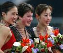 KWAN MAKES HISTORY BUT SLUTSKAYA LEAVES WITH GOLD... March 23, 2002. Happy tears streamed down Irina Slutskaya's face as she stood atop the medal podium and received the gold medal for the first time at her seventh trip to the World Championships. All traces of her Olympic disappointment seemed to be washed away. She skated first in the top womens' line-up, delivering a strong and clean program.Silver medallist, Michelle Kwan, made history tonight receiving her seventh World medal - more than any other American skater. Clearly disappointed with her second place finish, she was all smiles as she congratulated the new World Champion. Both ladies have been competing against each other since 1994. There were more tears on the medal stand as Fumie Suguri accepted the bronze medal. It was the first medal won by a Japanese woman since Yuka Sato won in 1994. Ironically enough, Suguri is trained by Yuka Sato's father.