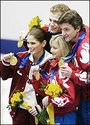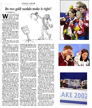 SKATING STARS POSE FOR FASHION AD...Kristi Yamaguchi, Tara Lipinski, Jenny Meno, Todd Sand, and Katarina Witt featured in the December issue of Rosie Magazine's Holiday On Ice fashions.CANADIAN PAIR TURN PRO...SURPRISE? May 1, 2002. Jamie Sale and David Pelletier announced on Tuesday that they are retiring from amateur competition and going pro. This annoucement came shortly after the news that French judge Marie-Reine Le Gougne and her federation chief Didier Gailhaguet were suspended by the ISU for three years. Le Gougne and Gailhaguet seemed to be at the center of the Olympic Scandal involving Sale and Pelletier.Speaking with reporters today, the pair team said that the ISU decision had no influence on their decision to turn pro. "Before all that happened, we had talked about this maybe being our last year," Pelletier said. Hmmm. That's news to the pair's fans. Sale said they wanted to leave amateur competition on a postive note. (You can't get a more positive ending than a gold Olympic medal - "co" or not, "controversy" or not.) The Canadian couple look forward to the more relaxed schedule of pro competition and a chance to enjoy more time off the ice. Don't look for a retirement announcement from their co-gold medal winners, Berehznaya and Sikharulidze of Russia. Though they have decided to take a year off from competition, they are not ready to hang up their amateur status just yet. This team has such a driving spirit that I wouldn't be surprised if they set their sites on the 2006 Olympics to stand atop the medal podium - ALONE. FRENCH JUDGE AND FEDERATION CHIEF SUSPENDED FOR THREE YEARS...May 1, 2002. French judge Marie-Reine Le Gougne and her federation chief Didier Gailhaguet have been suspended from the ISU for the next three years and banned from participating in the 2006 Olympics. The decision was made after a two-day hearing by the International Skating Union in Lausanne, Switzerland.Both plan to appeal the ISU's decision while others involved were disappointed that the judgements were not harsher. It is hard to predict if the Olympic scandal will do more to boost judging reform in the future. One thing is for sure, it is not soon to be forgotten.
