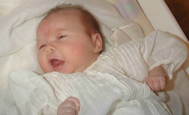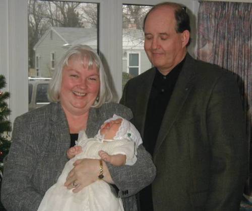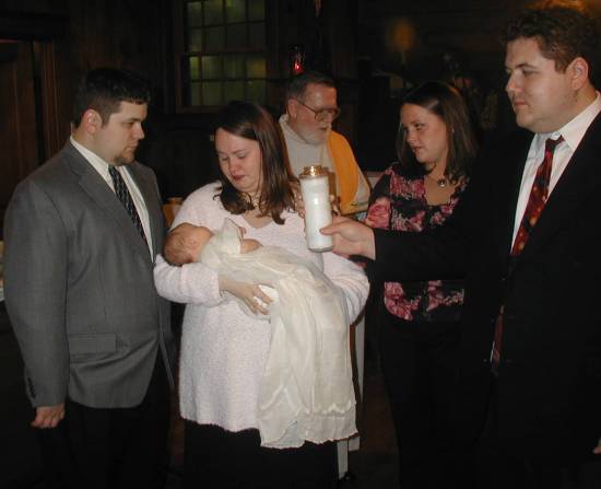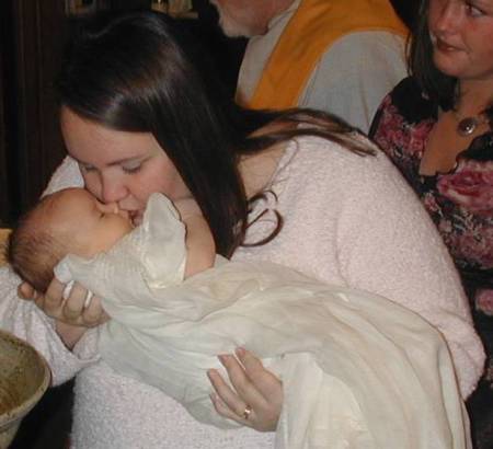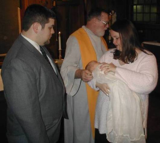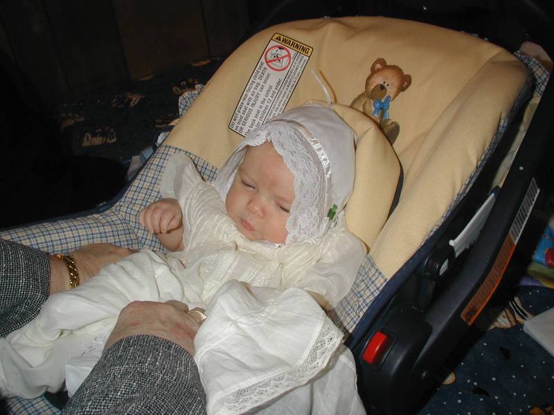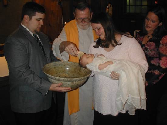 Maggie being anointed with oil and then with water. Amazingly, she only flinched briefly when the water was poured on her, and then continued to sleep! |
