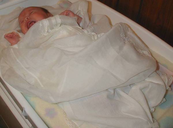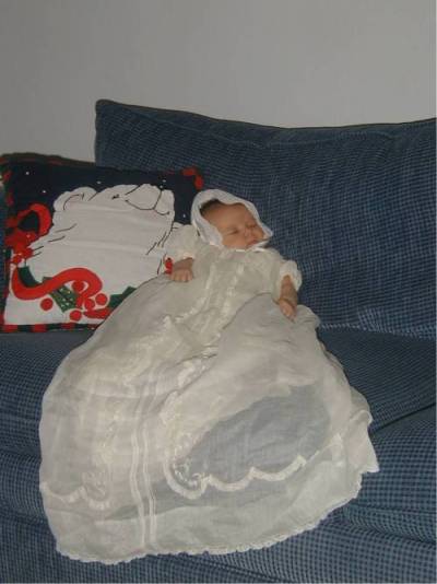 Maggie's beautiful baptismal gown. The gown is a family heirloom. My maternal greatgrandmother, a seamstress, made it for my Aunt Cindy's baptism. Since then, every child in the family has been baptized in it. |