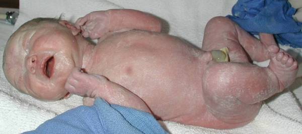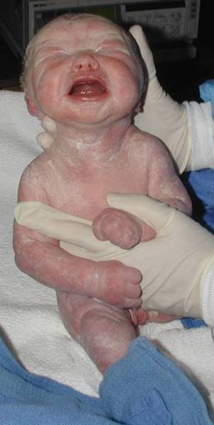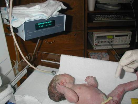 Since Maggie was born 3 1/2 weeks early, there was of course a small possibility that she might not be healthy. At that age, the main concern is whether or not the lungs are mature enough for the baby to exist outside the womb environment. A good holler at birth is the best sign that the lungs are mature. As you can see, she proved very quickly that her little lungs were just fine! |