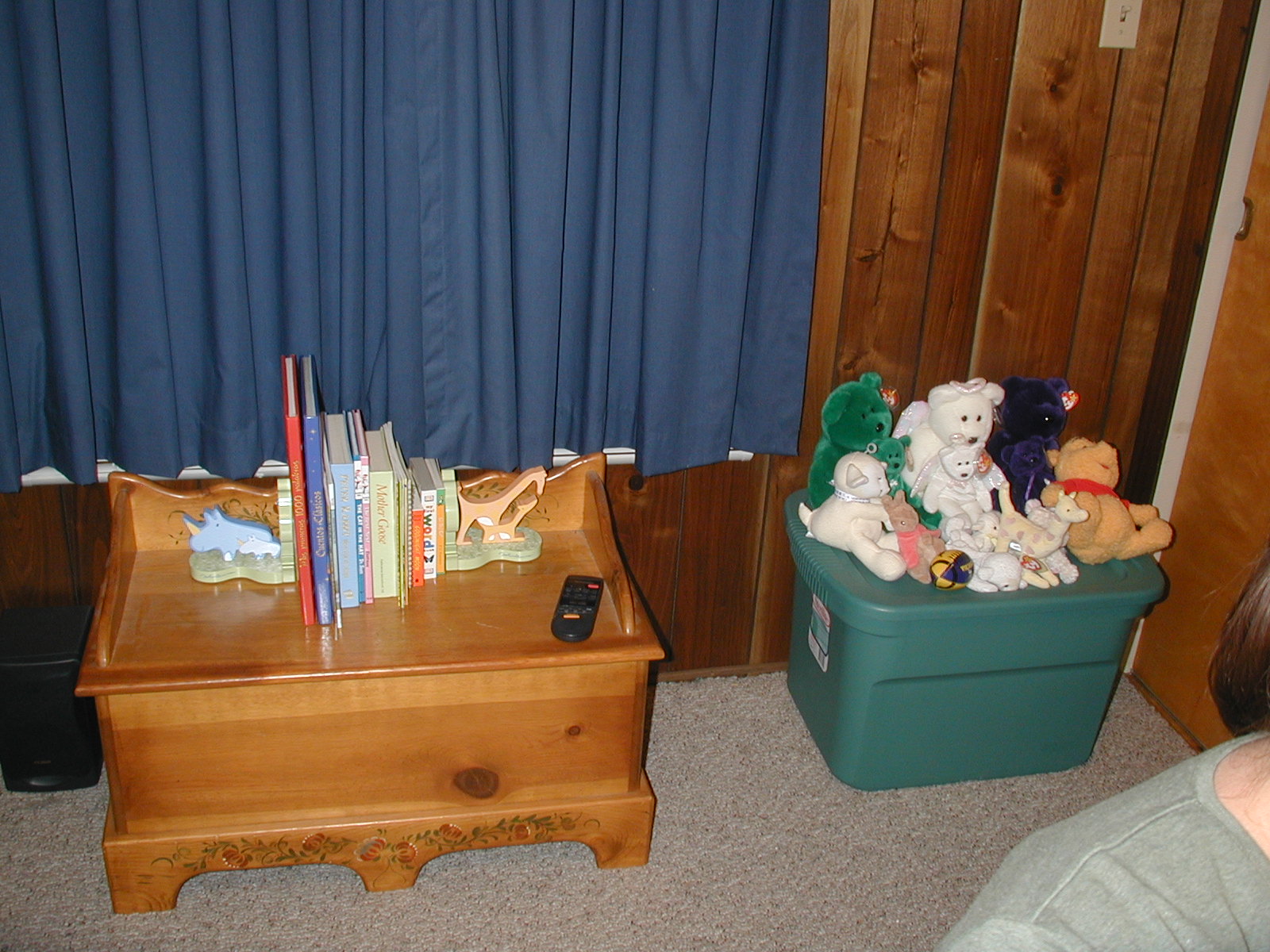 We've chosen to use my hope chest as a temporary bookshelf. Although they are a bit difficult to see, the bookends are also from the Lennon collection. The rubbermaid bin isn't exactly pretty, but it's holding some stuff Maggie won't need until she's older and is also a convenient place for all the stuffed animals she can't play with yet. |