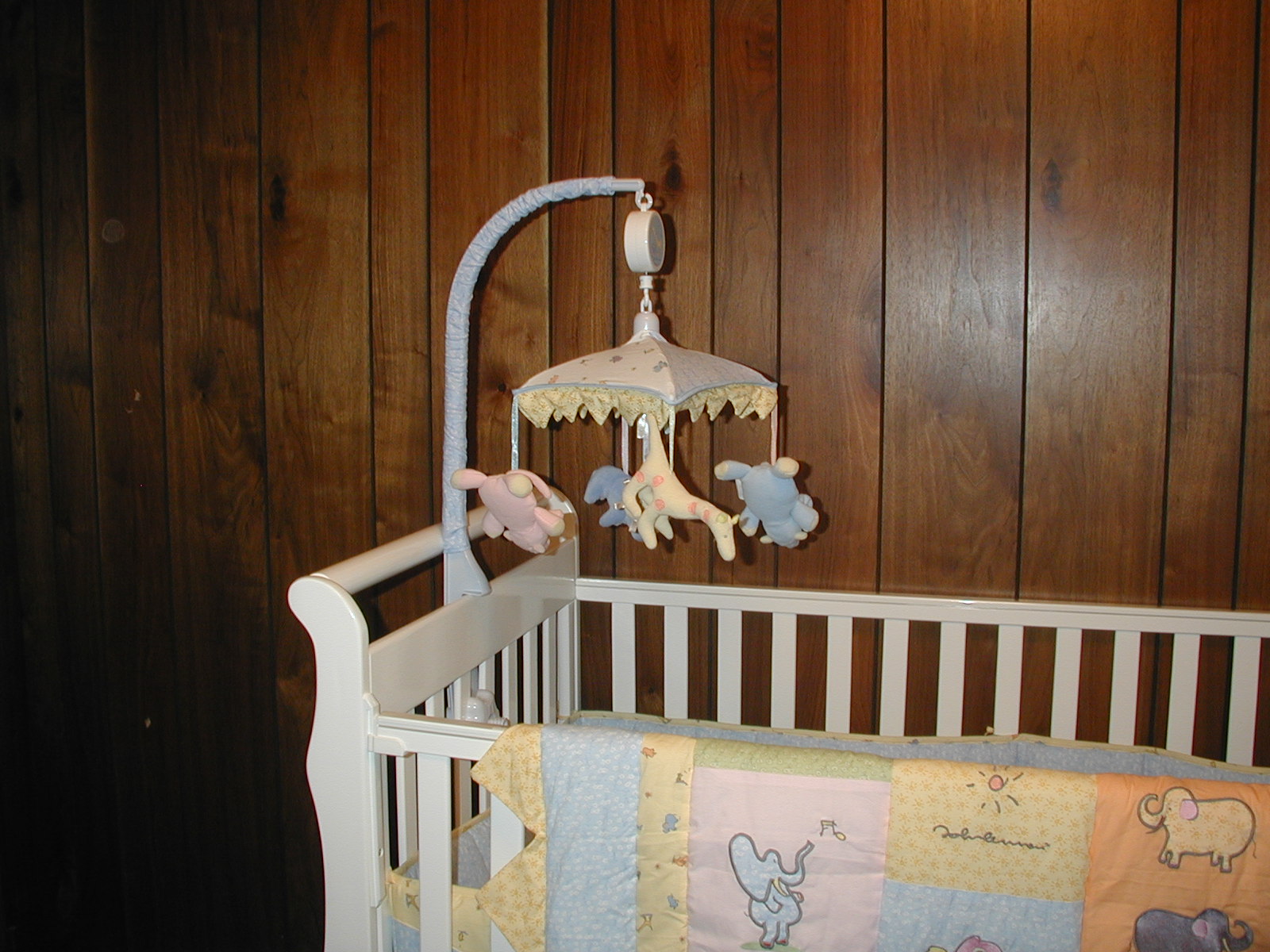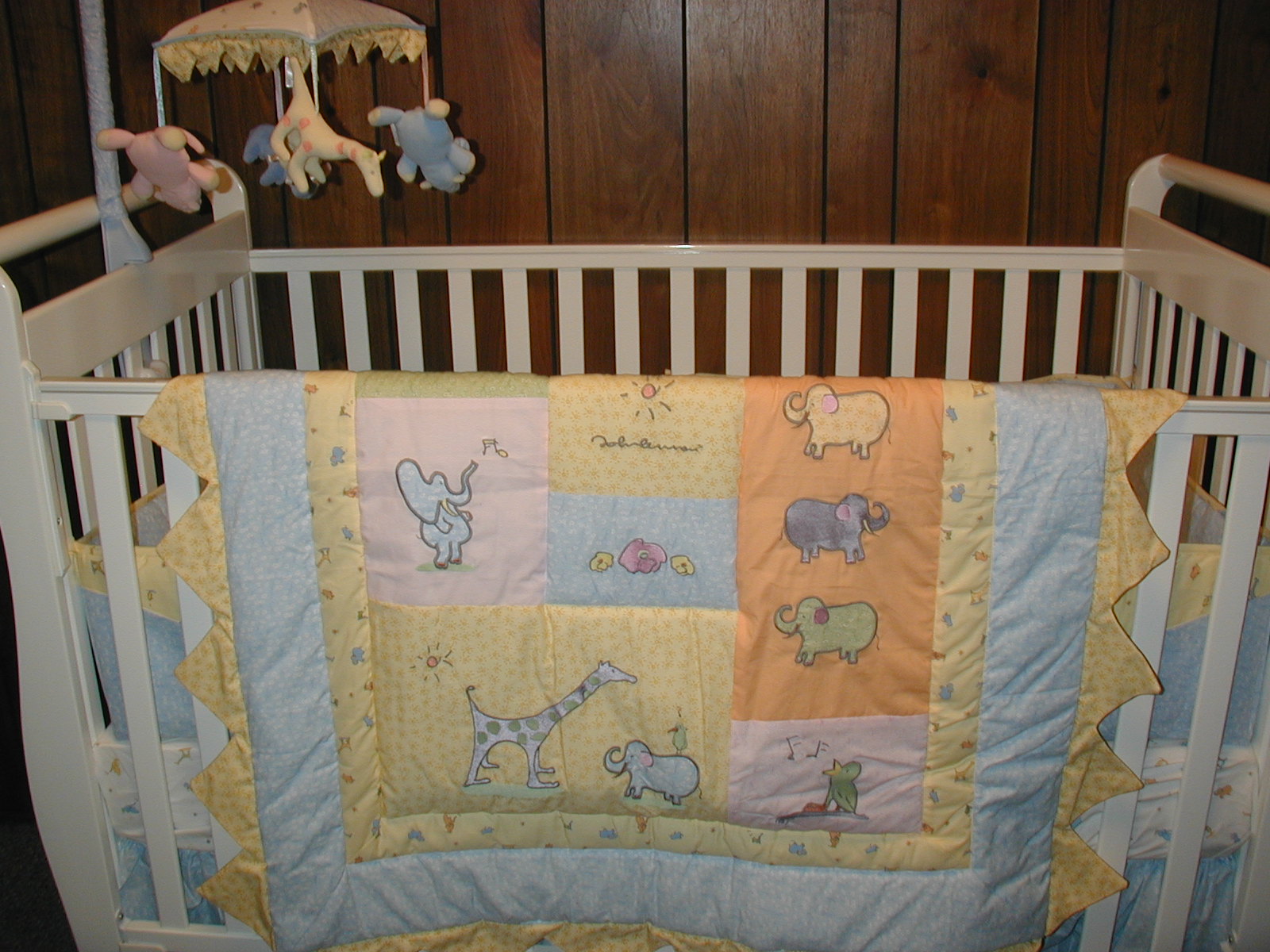 The centerpiece of the room: the crib! The quilt and mobile are both part of the Lennon baby theme we're using in the room. |