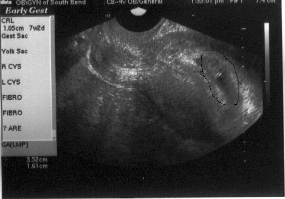 | As you can tell, there's really not much to see yet. In the circle I drew on the right-hand side of the picture, however, you should be able to see two white lines. Those two white lines mark off where the flickering little heartbeat is, and that's pretty exciting! Click here to read about the day we had this ultrasound done. (April 11, 2002 - 7 weeks, 2 days) |