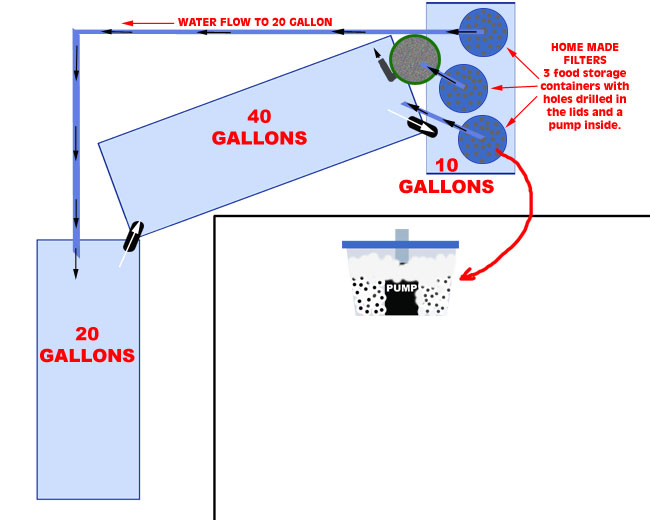 | This growout diagram is of my initial system for the first batch of fry that I reared to adults. As you may have seen, I now have modified this fishroom with 8 or 9 aquariums on central filtration systems. (see 'Fish Room' ) The homemade filters sketched below are, however, very effective and I still use one or two from time to time on very heavy bio-loads. |