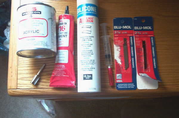 Step one is deciding what size tank to build, this will determine the thickness of acrylic sheet required. The height of the tank, not the gallons, determines the thickness required. You can have a huge shallow tank for a lot less money than a taller, smaller tank, something to consider if money is an issue. Expect to pay $60-70 for a 4ftx8ft sheet of 1/4" acrylic, $110-130 for 3/8" sheet, $150-180 for 1/2" sheet. You can see that the price goes up quickly as the acrylic gets thicker. Since you're on an African Cichlid site, you'll be happy to know that most African Cichlids do just fine in tanks 24" deep or shallower. Anything over 2 feet tall requires acrylic thicker than 1/2", and we won't go into building tanks taller than 24". Tanks up to 13" tall can be assembled with 1/4" acrylic, from 13"-19" w/ 3/8" acrylic, and tanks over 19" up to 24" require 1/2" acrylic. Since the sheets are 4x8, it's to your advantage to make tanks that can use as much of the sheet as possible w/out waste. For example, a tank that is 4 feet long, 4 feet wide and 2 feet tall ( a 4x4 cube tank) would require only two 1/2" sheets. But a tank 8 feet long, 2 feet wide, and 2 feet tall would require 2 and a quarter 1/2" sheets. But both tanks have the same capacity~240 gallons When designing your tank, it helps to get out some paper and see how much tank you can get out of the least amount of sheets. I've got a lot of experience w/ this, and w/ a little time you'd be amazed what you can get out of a couple sheets of acrylic! Some sites show acrylic tanks being built w/ strips along the top to brace it from bowing, In my opinion it's much safer, stronger, and better looking to have a solid top piece w/ the openings cutout. This adds a bit to the cost, about 15%, but it's a small price to pay in the long run. Once you have an idea of the size of your future tank, and the amount of acrylic you'll need, the next step is locating a plastic supplier. Look in the Yellowpages under "plastics", if you live in a large city you should find several suppliers, if not, you may have to check your nearest large city for listings. YOU MUST USE "CELL-CAST" ACRYLIC SHEET, THIS CANNOT BE OVEREMPHASIZED! Try several different suppliers, you'll be surprised how the price varies, and MAKE SURE to ask if they include cutting in the price~trust me, you do not want to attempt the cuts yourself, except cutting out the lids & plumbing holes. This article will only deal with square or rectangle tanks, other types require a bit more experience, and I'm not in a position to explain how to do hexagon, curved, or other designs. When making a tank, you want the top, bottom, front & back to all be the same length. The side pieces will be the width minus 2 times the plastic thickness. For example, a tank 6 feet long, 2 feet deep, and 18 inches tall, which would require 3/8" thick acrylic, will have a front, back, top & bottom ALL 6 feet long, the top & bottom will both be 6'x2', the front&back will both be 6'x18inches, and the sides will be 18"x24"minus 2X 3/8"=3/4" so the sides would be 18"x23 1/4", I hope this is clear, if not e-mail me. Once you have nailed down a plastics supplier, let them know you'll be making an aquarium and the cuts MUST be exact, there's not much room for error here and most good shops will make satisfactory cuts, but be sure to take a tape measure w/ you when picking up your order, and do not accept any pieces that are more than 1/16" off your measurements! Some shops can router finish your pieces, and if you don't mind paying a bit extra for this service, it can result in beautiful joints, but you can make a good strong joint w/out the router finish, just not quite the same clean look. One more thing, ALWAYS ask for some acrylic scrap when picking up your order, most shops have a pile of odd pieces and you can use these for cement practice, and for little odds & ends. Your cut pieces will have a protective plastic or paper attached to it, DO NOT remove the paper/plastic while assembling the tank. Take all your cut pieces and do a test fitting, they should fit well w/ no visible gaps along the sealing edges, and should not overhang the top & bottom pieces, but it IS OK if the pieces are a bit shorter than the top & bottom pieces. If you have some cuts that are a bit off, you need to use them for the top seal of the tank, you DO NOT want any visible gaps on your bottom or side seals, these are the joints under the most pressure and need to be solid. If you have any plumbing that needs to be addressed, it's much better to plan ahead and do the cuts prior to assembly, but they can be done later if you don't have your system finalized. You also need to outline your cuts for the tank lids, make sure you have a center space between the lids that's at least 8 inches wide, this will provide support, and keep the tank from bowing out, and the side, front & back spaces should be at least 4 inches wide to keep the tank rigid. For example, the above tank example would have 2 lids w/ 4 inch spaces front, back& side, and 8 inches between the lids. This would make each lid 28"longx16"wide, again, hopefully this is clear to you. THE TANK IN THE PICTURES IS A 190 GALLON, THE SPECS ARE: 78"Widex30"Deepx18.75"High USING 2 4X8 SHEETS OF 3/8"ACRYLIC, TOTAL COST: $240 The following are the tools or items you'll need to complete your "dream tank": 1. Weld-on #4 Solvent Cement 2. Weld-on #16 Thick Solvent Cement (optional) Aquarium-safe Silicone (preferred) 3. A Solvent bottle or Syringe w/25guage needle (I prefer the syringe, very cheap too @ vet/livestock supply shops) 4. 2-3 rolls of electrical tape 5. 2 sawhorses 6. 1 drop light 7. Jigsaw/SabreSaw and appropriate blades for cutting plastic 8. 2-flute square-cut router bit (no router req'd) Weld-On Products & the Solvent bottle will be available where you buy your plastic. Any time you drill or cut acrylic sheet you need to have a spray bottle w/ water so you can keep the saw blade, holesaw, 