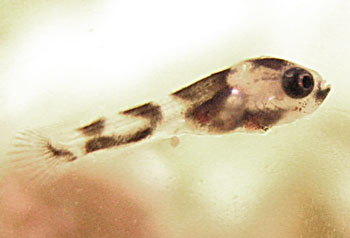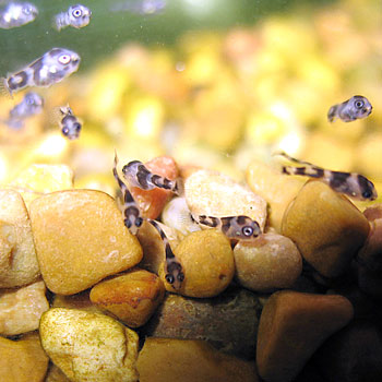 These babies are 8 days old and swimming briskly about the aquarium. They can be seen burrowing into the gravel looking for food and microworms. |