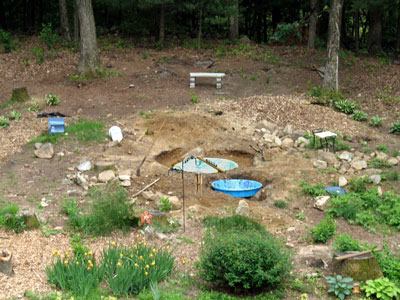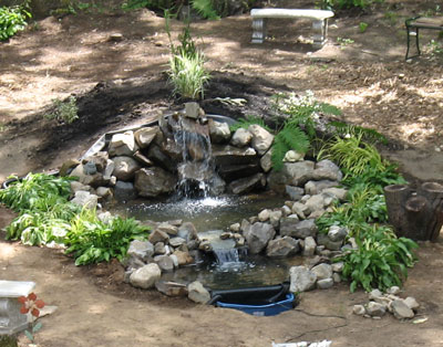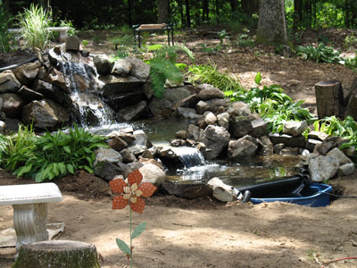 I still have plenty of work to do on this water feature. Lots of planting and some additional landscaping need be done before I can call it finished. But at least all the heavy work is done. This is NOT a KOI pond but simply a garden water feature that will eventually have plants in and around it. The sound of falling water is very relaxing and I can clearly hear it from the back deck on the house. I'm anxious to install some lighting in and around the water fall for some great twilight effects as our summer days get shorter. I'll be adding more pictures as I continue working on it so come back soon and check in on the progress. :)