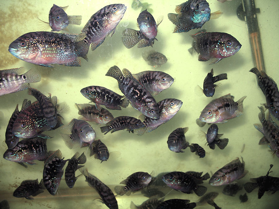 | These Jack Dempseys range in age from 3 months to 5 months. There are approximately 90 of these guys in this 55 gallon tank. I siphon the bottom of the tank daily and clean the filters every other day. The 55 tank is one of 5 aquariums all connected to a central filtration system. There is a bio-tower suspended over the sump filter that has 300 gph pumped through it. I don't use carbon in this system because with the constant daily water changes of 20% to 25%, carbon is a waste of money. Hopefully these guys will all be headed off to pet stores for the fall stocking. All together I presently have about 300 juvenile Jack Dempseys. |