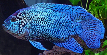The principle reason that Electric Blue Dempseys are not widely available on the market, and that prices remain high for the species ($30-$60), is due to the fact that breeding Jack Dempseys to achieve Blue Dempseys is a tricky proposition. Two blues bred together will not produce a full blue offspring. To achieve full blue offspring, you must first start with a blue male and breed him with a regular color female Jack Dempsey. The offspring that this pair creates will appear as regular Jack Dempseys, but the difference is that they will carry the blue gene. This group of fish must now be grown out to the size where a female can be determined and selected and bred back to the original blue male. The offspring of this pairing will produce an indeterminant number of true blue variant fish. Obviously a project like this is not for the faint of heart and will require enormous growout type of facilities.