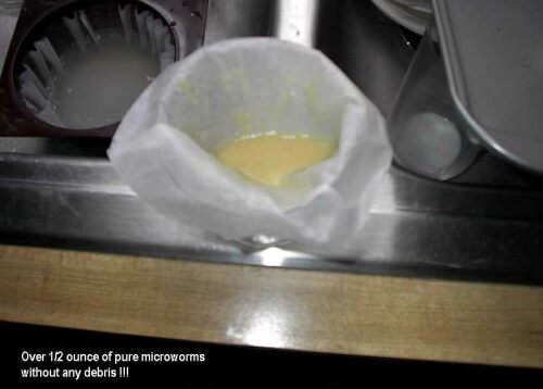 I only recently bumped into this site as a result of my search for a microworm culture. Only then did I learn of this valuable resource to share ideas and experiences. Well, I would like to share with all of you an incredible harvesting technique that I just discovered. I used to grow microworms many years ago when I had over a dozen tanks in my parents home. I found them to be a very valuable live food for young fry. Now I am showing my children then joy of keeping an aquarium and breeding. I remember never being able to harvest enough worms for all my young. In an effort to increase my harvest, I would always have 6 -12 cultures going. The time tested method of harvesting these worms is to scrape them off of the side of the container as they climb out of the medium. Indeed, this is what I did many years ago and it is also the instructions I received from Clint when I ordered my culture. However, if you have kept microworms before, you have observed the same thing as me - most of the worms are on the surface of the medium. Only a small fraction of them actually climb out to be harvested. Of course, if you try to harvest off the top of the culture, you will also get an unacceptable amount of the medium which you do not want to put in your tanks. A little background: I used to grow the worms only in a corn meal culture. We put this in plastic shoe boxes which were great because they were large and clear with covers. Per the instructions that Clint provided, I saw that you could also use other material such as oatmeal. So, from the starter culture I bought, I started two cultures; one in oatmeal and one in corn meal. I wanted to see which would work better (provide the most worms). These were both put in large plastic shoe box size containers. Both cultures grew well. However, even after 8 days of growth, there were not many worms climbing up the sides. Sure, there were millions of worms in each culture but they were mostly on top. I tried many things to harvest more worms but always got too much oatmeal or corn meal. So, after two days of experimenting, I tried something "revolutionary." In fact, it worked so well, I believe it could become the new standard for harvesting these worms. Would you believe that at each feeding, I actually harvested MORE worms than I could use. But now I just take less by choice. Here's the technique: First, wait until your culture has reached maturity (has a gazillion worms crawling all over it). Then cut a piece of paper towel to fit over about half of the culture surface. You can decide later if you want to use more or less towel. The size of the towel will determine your harvest size. Now thoroughly wet the towel in fresh water and squeeze it so it is just damp. You are going to lay this towel over the top of the culture. We dampen the towel so as not to deplete the moisture in the culture. If you see your culture getting dry, just add water. Now, cover it and just wait a few hours. I let mine wait overnight the first time I tried it. In this time, worms will cover the surface of the towel. Now just remove the towel. It will be literally saturated with worms. The towel comes out virtually "clean." It comes out a bit cleaner from the oat meal culture but I believe the corn meal culture provides more worms. Rinse the towel in a cup or two of clean water. It usually takes me two cups of water just to rinse the towel to the point where it looks like it is free of worms. Then I finish rinsing the towel in one of my fry tanks. Even after taking the vast majority of worms off of the towel and then dipping the "empty" towel in a tank, I am probably overfeeding this first tank (thousands of worms still on the towel). Next, I pour the cups containing the worms through a #2 cone coffee filter that I put in a second cup. I rinse this through 2-3 times. What is left is millions of worms in the coffee filter that you can use to feed more fry than most of us will ever have. I took a photo of ONE of my worm harvests from one culture. It is an unbelievable sight. I weighed the harvest - it was OVER � ounce of worms without any debris. I had so much left over that I fed my adult tanks with it also. I weighed the harvest - it was OVER � ounce of worms without any debris. I had so much left over that I fed my adult tanks with it also. Bill is still working on perfecting his new harvesting technique and has sent this update: Hey, I actually improved on the "millions of microworms" harvesting method described in the article you put on your web site for me. It totally eliminates the process of filtering the worms through a coffee filter. Although filtering works, I have found over time that sometimes the filter "clogs" and it takes a long time to get the worms "purified". Also, some of the worms go through the filter and are lost. Check this out - imagine being able to dip a teaspoon and get ONLY worms. No filtering, no trouble whatsover. Here's my final setup: Get a worm culture going the normal way. Although my original article indicated that I thought the oatmeal was a better medium than cornmeal, I now prefer cornmeal (it stinks less, it seems to work better and it lasts longer). So ... 1) Get a cornmeal worm culture started and wait until it is going strong. 2) Lay a paper towel over the well-populated culture (same as before). Sprinkle a few teaspoons of fresh water on top. 3) Wait until you see the worms in abundance on top of the towel (same as before). 4) Now, instead of removing the towel, leave it in place. Just use a spoon to gently scrape the worms right off of the towel. You get no cornmeal (or just a couple of specs). From my experience, you can leave the towel in place (as long as you don't tear it which if you do, just buy a stronger towel, not the cheap store brand) for the LIFE of the culture. This works better because it doesn't disturb the culture and the only worms disturbed are the ones you harvest. The culture continues without interruption - there is